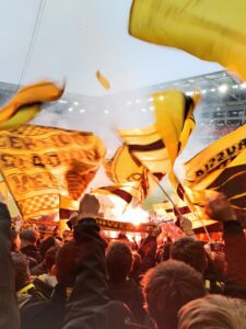 Gegen 13:00 Uhr fuhren wir den kurzen Weg zum Stadion am Flugplatz und enterten auch direkt den Gästesteher, um dort mit verschiedensten bekannten Gesichtern anzustoßen. Die Stimmung war ordentlich an diesem Sonntag im Dezember – das Spiel hatte wie so oft in den letzten Wochen Luft nach oben. Ein mageres (glückliches) 1:1 sprang am Ende für unseren BVB heraus, was an dem Tag das Maximum darstellen sollte.